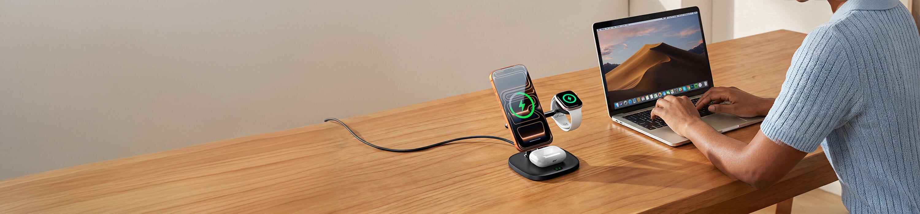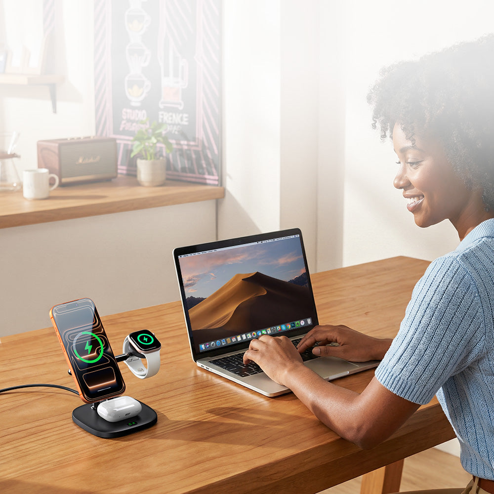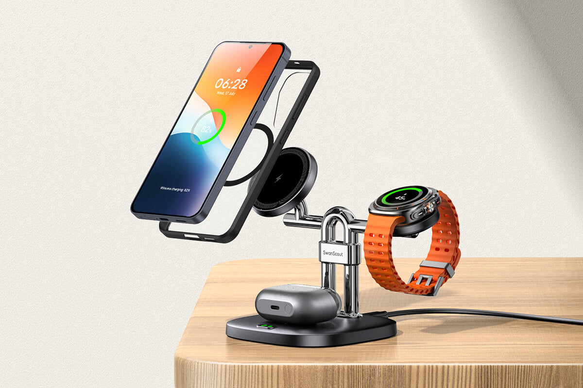 Descubre los elegantes cargadores inalámbricos de SwanScout para el hogar y la oficina. Diseño elegante con carga rápida inteligente para múltiples dispositivos: teléfono, auriculares y reloj.
