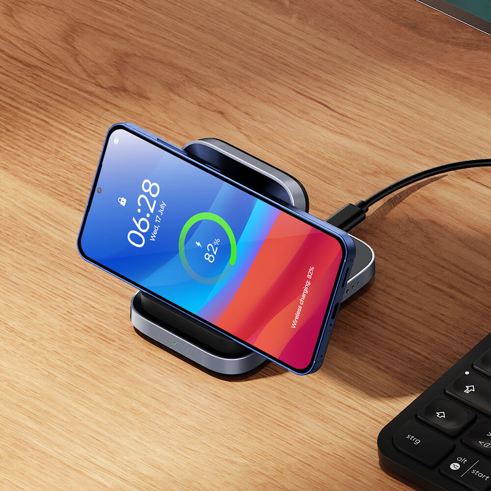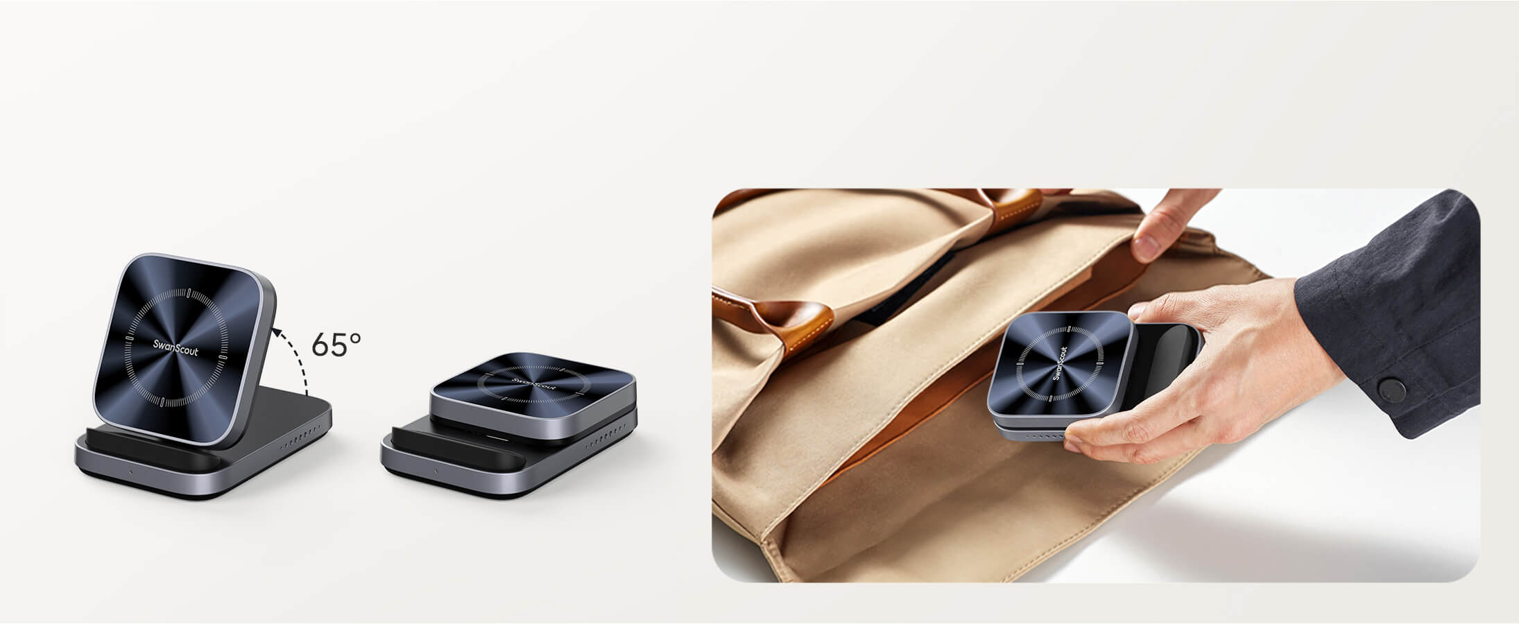 - Přenosná skládací konstrukce: Lehký a kompaktní skládací design, který snadno vložíte do tašky nebo kapsy, takže rychlé nabíjení máte po ruce doma, v kanceláři i na cestách.