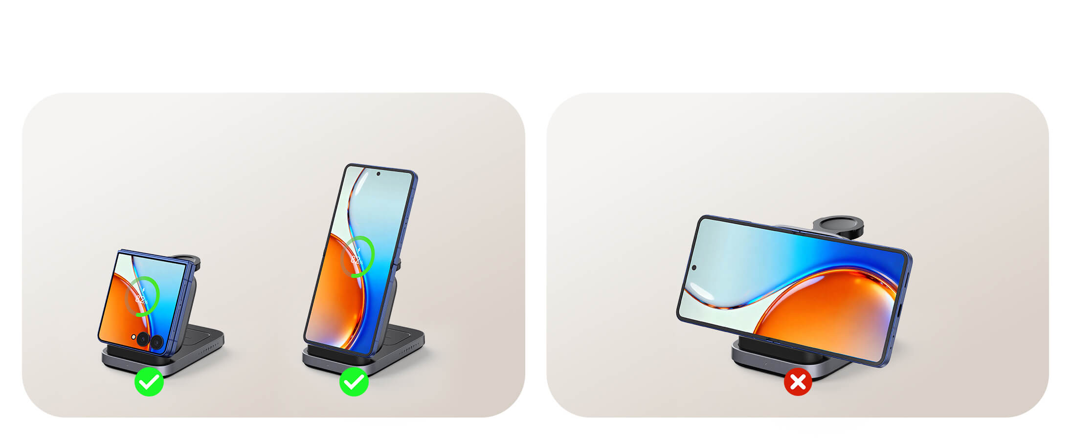 - Kann dieses Produkt die Samsung Galaxy Z Flip-Serie horizontal aufladen, wenn das Telefon aufgeklappt ist?