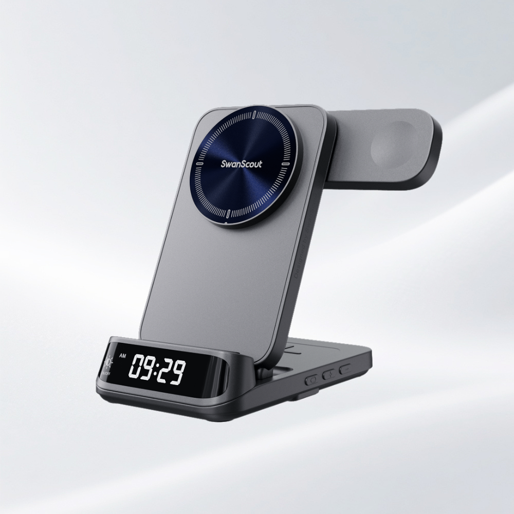 SwanScout 701A is a 3-in-1 wired fast charger compatible with Apple phones, watches, and earbuds, offering stable and efficient charging in one sleek unit.The swanscout 701A is a stylish alarm clock with cell phone charger, combining fast charging with a digital time display for added convenience.