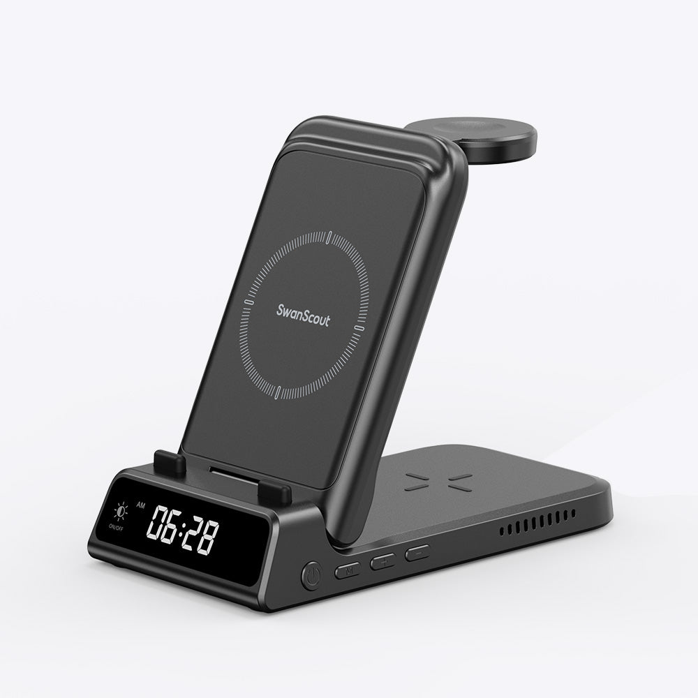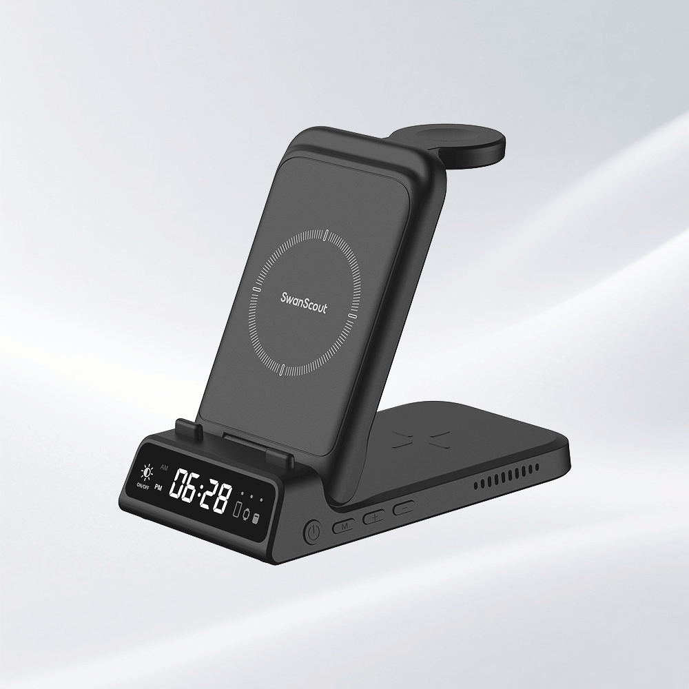 SwanScout 701A is a 3-in-1 wired fast charger compatible with Apple phones, watches, and earbuds, offering stable and efficient charging in one sleek unit.The swanscout 701A is a stylish alarm clock with cell phone charger, combining fast charging with a digital time display for added convenience.