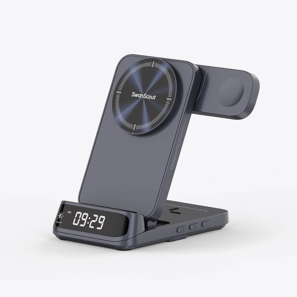 SwanScout 502M is a slim, 2-in-1 magnetic wireless charger compatible with Apple devices.The SwanScout 502M combines a sleek 2 in one clock phone charger design with an LED display and fast charging for daily convenience.