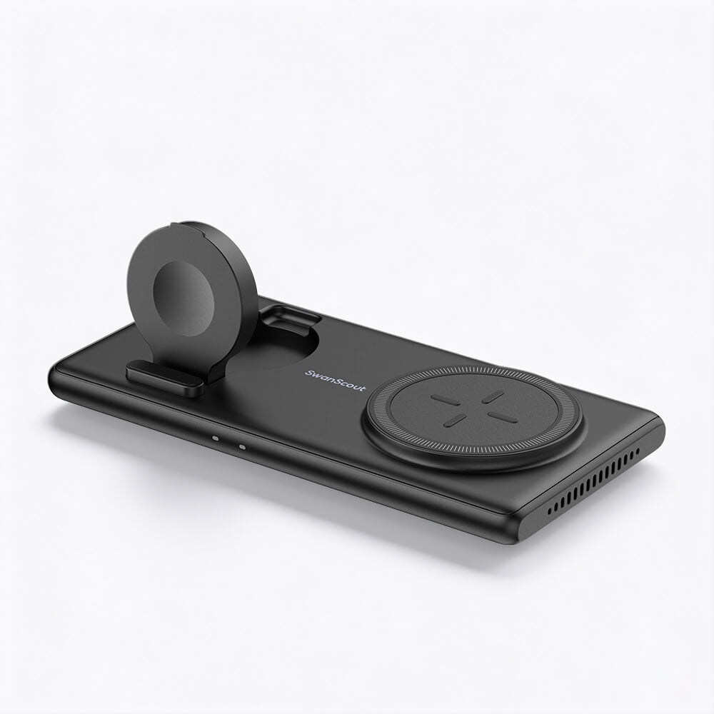 SwanScout 703A is a foldable 3-in-1 wireless charger compatible with Apple devices, featuring an elegant black design.The swanscout 703A is a sleek charging station tailored for Apple users.