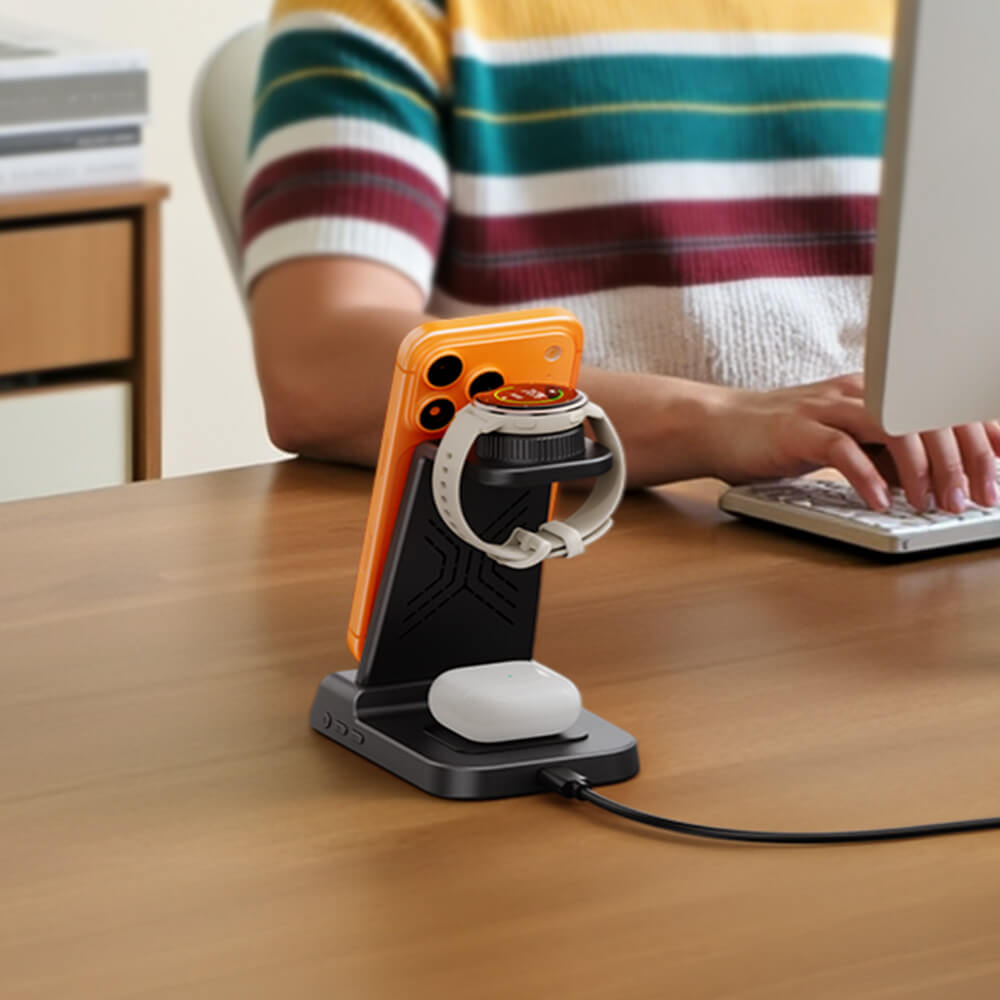 Soluzione all-in-one per caricare tre dispositivi, mantenendo lo spazio di lavoro pulito ed efficiente