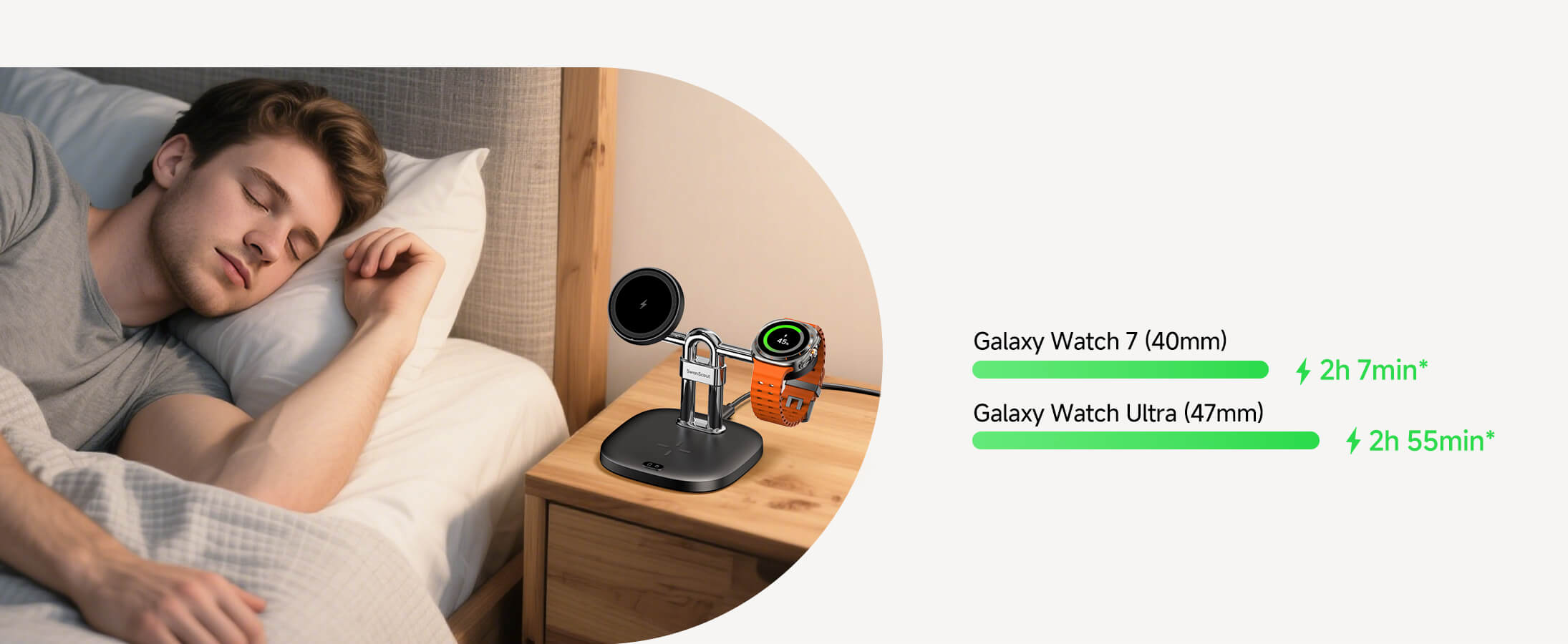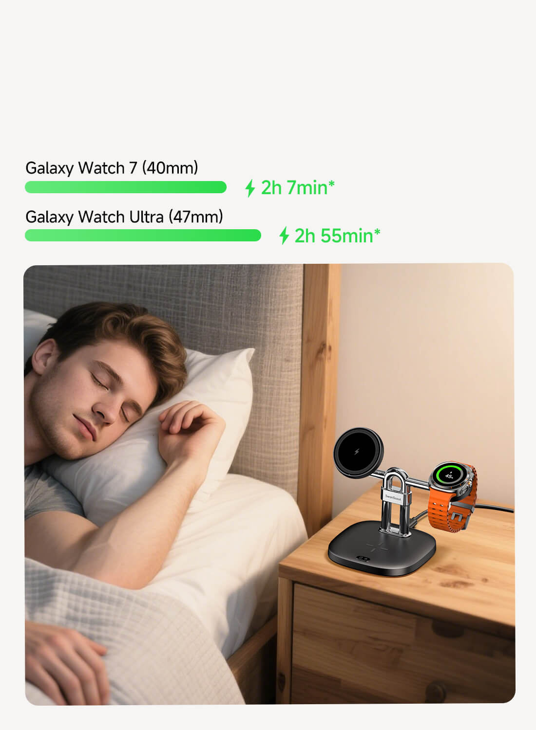 - 3-in-1磁気充電: Galaxy端末(磁気ケース必要)、Watch、イヤホンを同時充電。20W以上PDアダプター必要(同梱なし)。