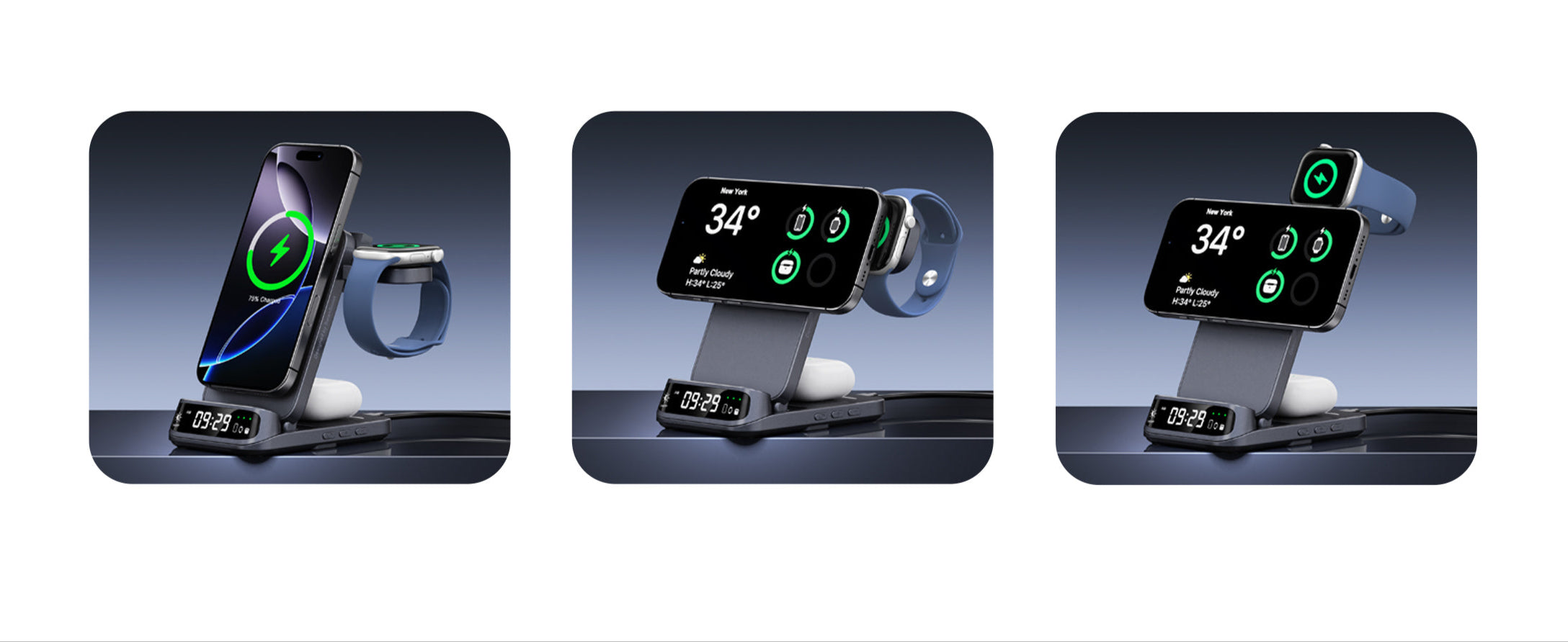 - Carregamento 3 em 1 que suporta múltiplos dispositivos.