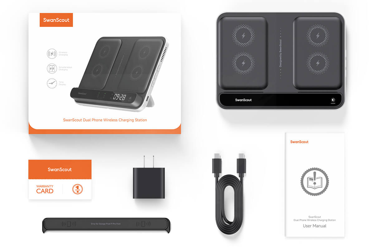 此产品也可能被称为无线充电器、无线充电站、双手机无线充电器、无线充电垫、无线手机充电器或无线充电支架。它设计为可同时为两部手机充电,并支持耳机充电。